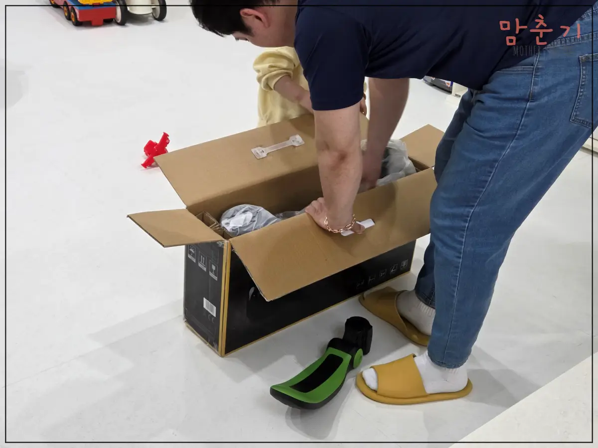 아이와 함께 택배를 개봉한 후에 그날 저녁은 집 안에서 가볍게 킥보드를 태워줬다. 사실 집이 좁아 첫날은 킥보드를 탔다기보다는 만지고 갖고 논 수준이랄까. 그동안 다른 또래 친구들의 킥보드를 보며 그리도 타고 싶고, 만지고 싶어 했었는데 드디어 자기 것이 생겨 좋은지 이 날 잠도 자지 않으려 하고 계속 킥보드를 만지작 거리고 놀았던 27개월 아들. ㅋㅋ